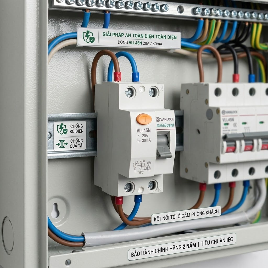 Ứng dụng lý tưởng: Nên kết hợp aptomat chống giật VLL45N cùng các dòng aptomat bảo vệ quá tải thông thường trong tủ điện tổng gia đình, phòng tắm (nơi lắp bình nóng lạnh), khu vực bếp ăn, hoặc các không gian ẩm ướt dễ xảy ra hiện tượng rò rỉ điện.