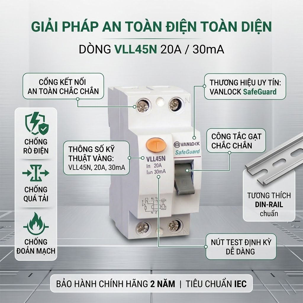 Trong các hệ thống điện hiện đại, bên cạnh việc chống quá tải, trang bị một chiếc aptomat chống giật là tiêu chuẩn bắt buộc để bảo vệ con người. Aptomat 2 cực VLL45N hoạt động như một “vệ sĩ” thầm lặng, liên tục giám sát sự cân bằng dòng điện. Chỉ cần một lượng điện cực nhỏ (từ 30mA) rò rỉ ra vỏ máy giặt, bình nóng lạnh hay do người dùng vô tình chạm vào ổ điện, chiếc aptomat này sẽ ngay lập tức sập nguồn điện, bảo vệ tính mạng gia đình bạn.
