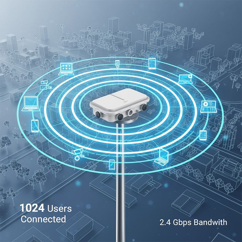 Thiết bị hỗ trợ chuẩn WiFi 6 (802.11ax), mang lại tốc độ truy cập lên tới 2.4Gbps cùng khả năng xử lý đồng thời lên đến 1024 người dùng, đáp ứng hoàn hảo cho các hệ thống mạng ngoài trời quy mô lớn.