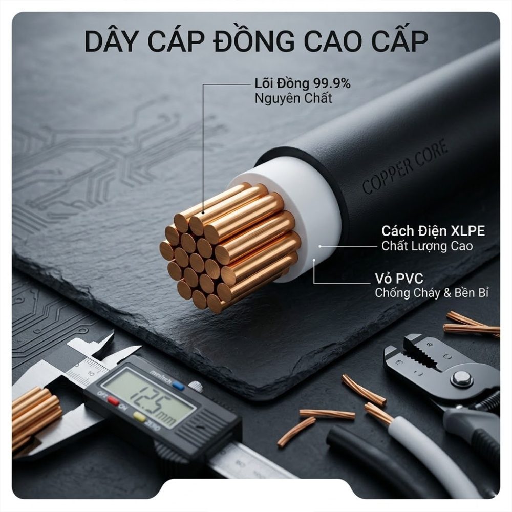 Ruột dẫn trung tâm (Cu): Làm từ đồng nguyên chất 99.9%, đảm bảo điện trở suất cực thấp, tối ưu hóa khả năng truyền tải dòng điện và hạn chế suy hao điện năng trên các tuyến cáp dài.