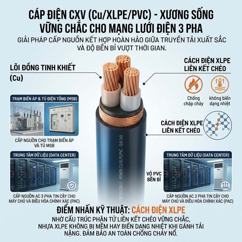 Cáp 3 lõi CXV là sự lựa chọn không thể thay thế khi thiết kế và thi công hệ thống điện cho các trạm biến áp, tủ điện tổng (MSB) của nhà máy, cũng như cấp nguồn AC 3 pha ổn định cho hệ thống máy chủ và điều hòa chính xác (PAC) tại các trung tâm dữ liệu (Data Center).