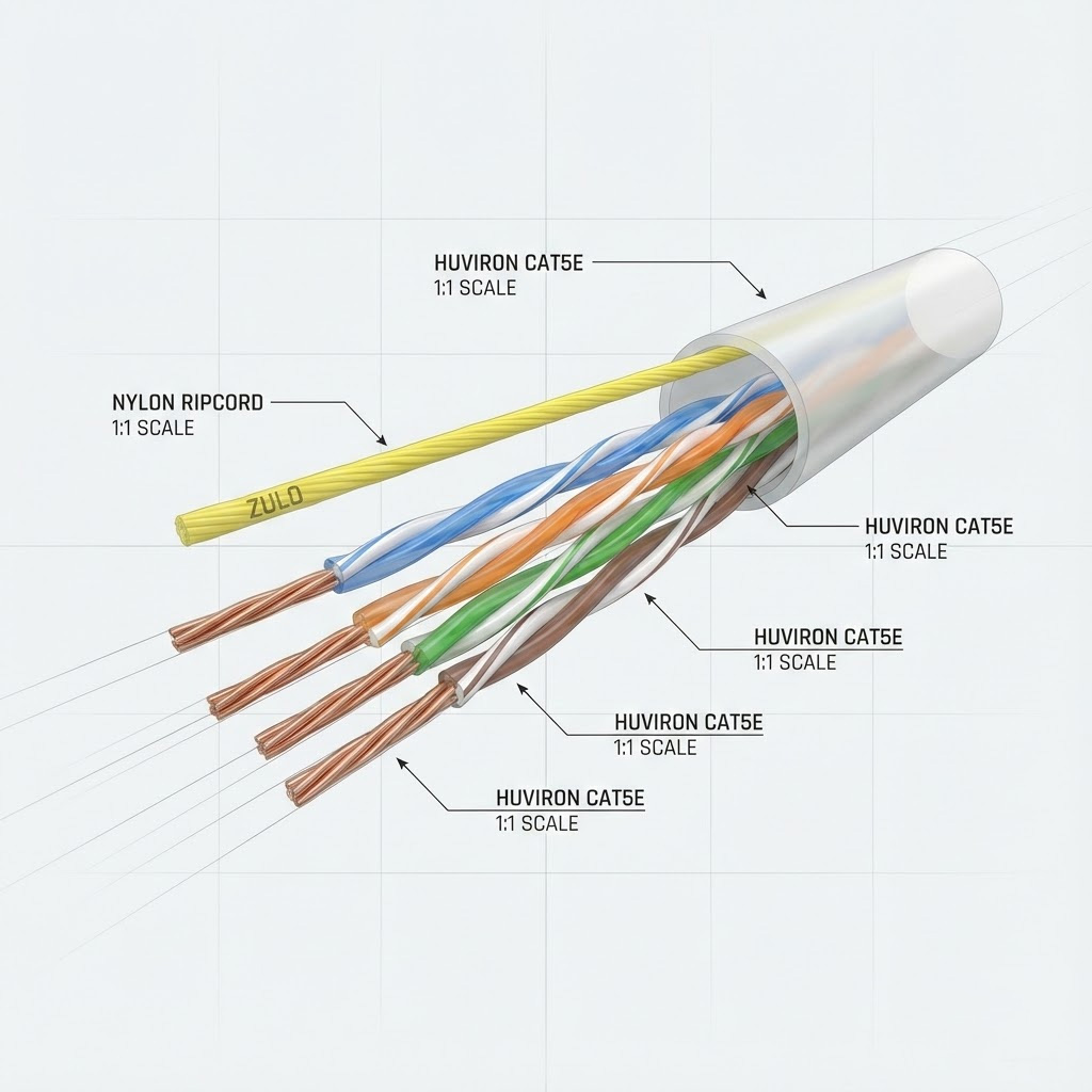 Dây dù chịu lực (Zulo): Sản phẩm được trang bị thêm sợi zulo nhựa (dây dù) giúp tăng cường độ bền kéo khi thi công, đồng thời hỗ trợ việc tuốt vỏ cáp dễ dàng hơn mà không làm ảnh hưởng đến lõi đồng.