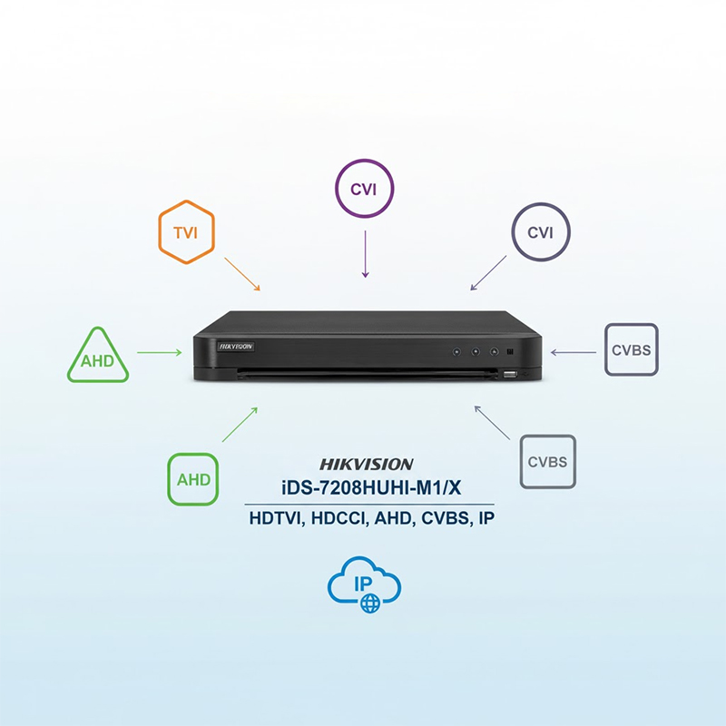 Đầu ghi hình IP iDS-7208HUHI-M1/X hỗ trợ đồng thời các chuẩn tín hiệu phổ biến hiện nay như HDTVI, HDCVI, AHD, CVBS và IP, giúp linh hoạt trong lắp đặt và tiết kiệm chi phí đầu tư. Đầu ghi có khả năng ghi hình từ camera có độ phân giải lên đến 8MP, mang lại hình ảnh sắc nét và chi tiết vượt trội.