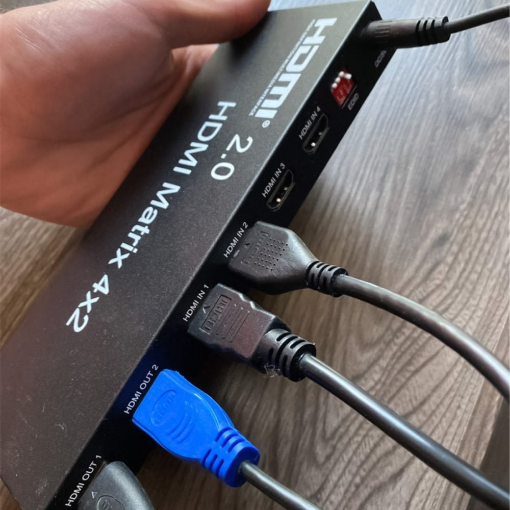 - Chức năng chính: Ma trận HDMI 4×2 cho phép chuyển đổi và phân phối tín hiệu từ 4 nguồn HDMI vào 2 đầu ra HDMI.