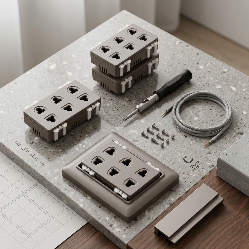 • Quy tắc thi công: Việc đấu nối dây điện và lắp ráp mặt hạt vào đế âm tường bắt buộc phải do người có chuyên môn, thợ điện lành nghề thực hiện để đảm bảo đúng kỹ thuật và siết chặt các tiếp điểm.