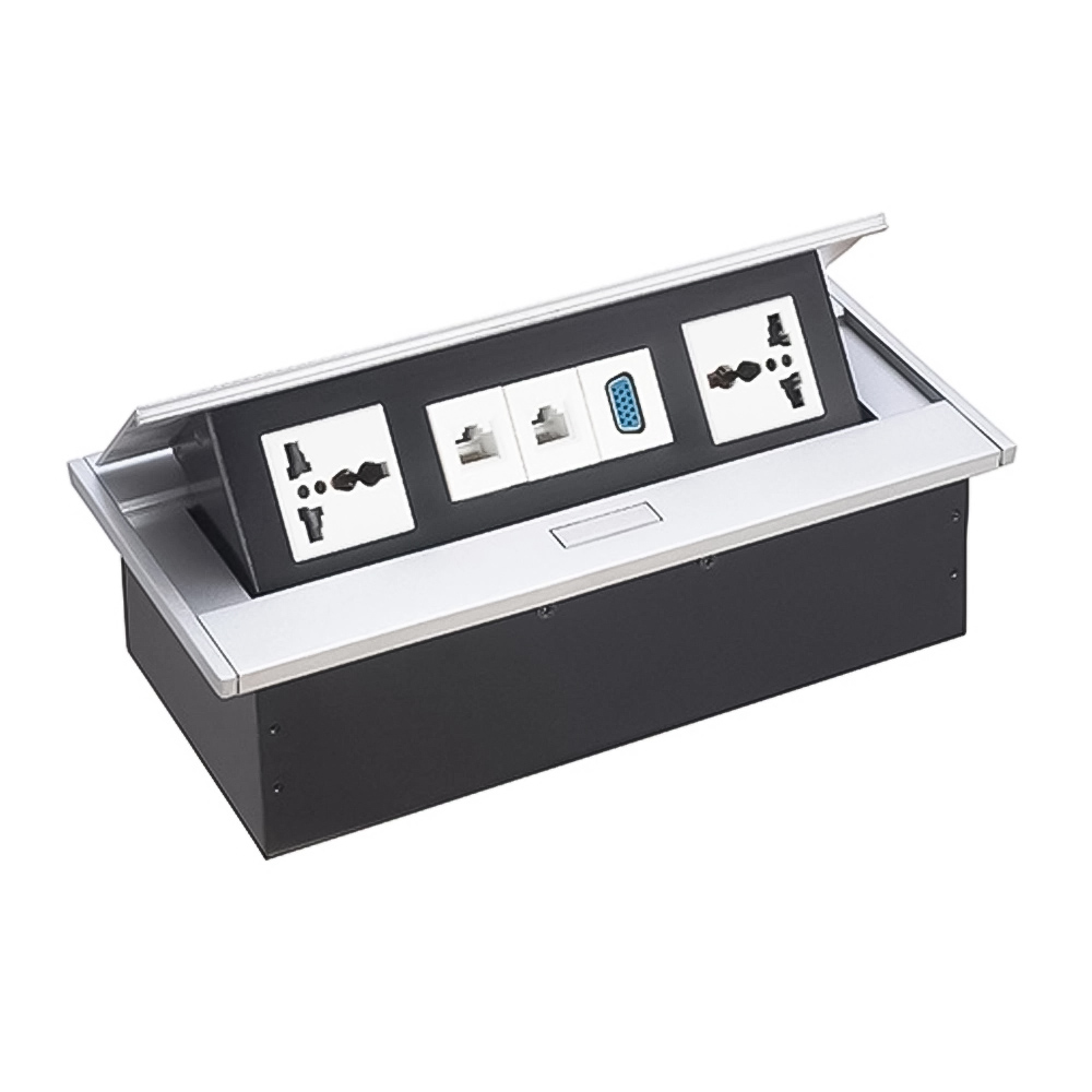 Hộp ổ cắm âm bàn được làm từ hợp kim nhôm, với thiết kế  hình chữ nhật tối đa 5 modules vô cùng sang trọng và tăng tính thẩm mĩ cho không gian làm việc.