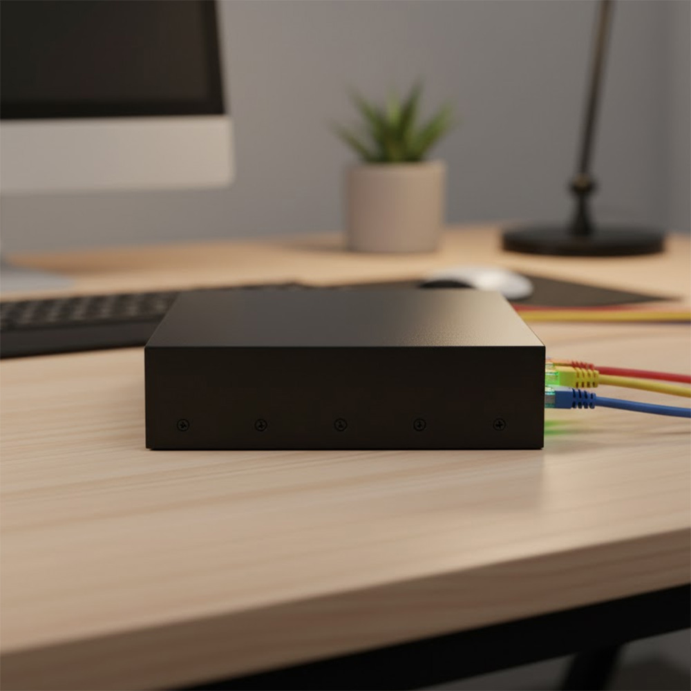 Switch PoE AirPro AP-ES108P-2GE được thiết kế vỏ kim loại chắc chắn, tản nhiệt tốt, hoạt động không quạt nên êm ái, không gây tiếng ồn, lý tưởng cho văn phòng, nhà ở hoặc cửa hàng nhỏ. Kích thước nhỏ gọn, dễ lắp đặt, có thể đặt bàn hoặc treo tường, phù hợp với mọi không gian làm việc.